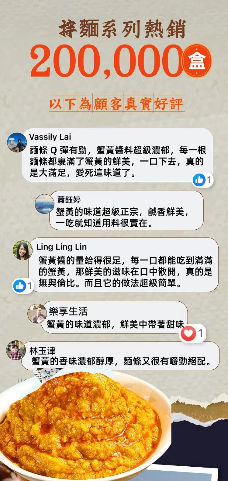 【藍海饌 限時優惠】雙十一特價蟹黃拌麵(蟹肉含量12%蟹黃含量5%) 二十入組-NT$1899(均價94塊)