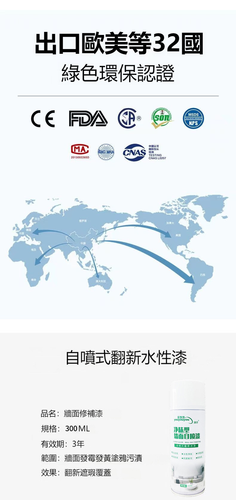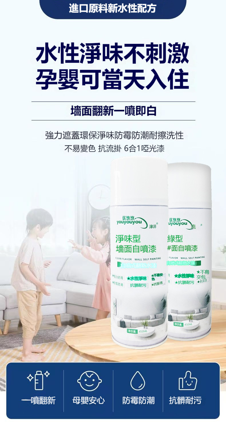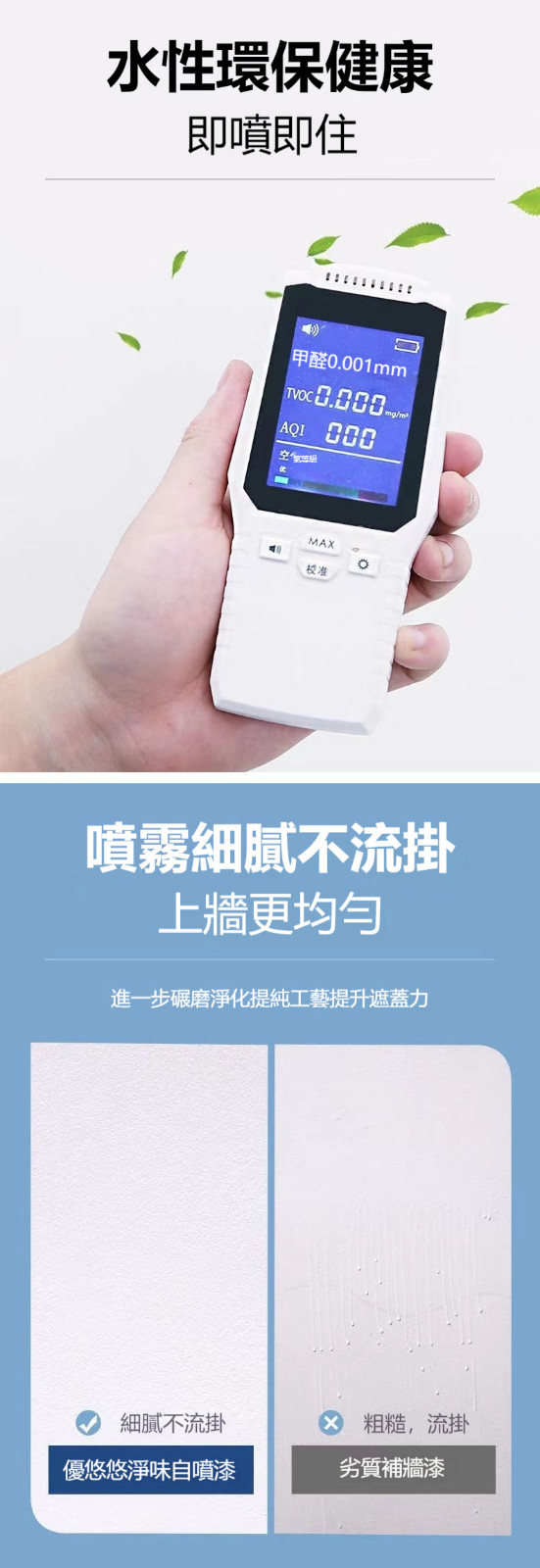 【墻面自噴乳膠漆】一噴即白輕松翻新,出口歐美等32國 綠色環保認證,進口原料6合1新水性配方,不含甲醛、苯、重金屬,凈味不刺激孕嬰可當天入住!