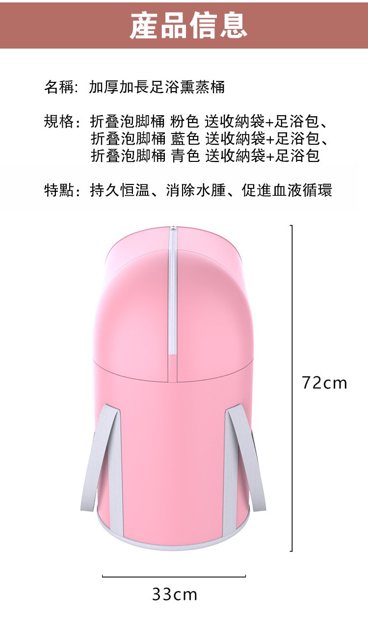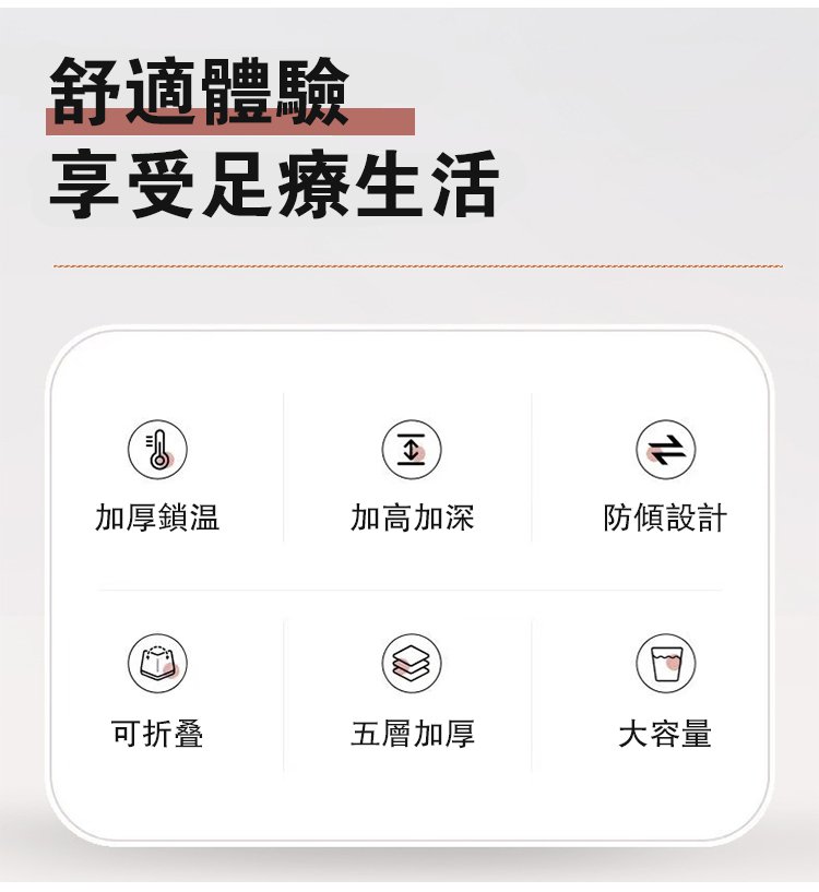 【摺疊泡脚桶】採用便攜折疊設計,節省空間,輕鬆收納,方便攜帶。無論是在家中、辦公室還是旅行途中,隨時享受溫暖泡脚的樂趣,迅速緩解疲勞,促進血液迴圈,呵護雙足健康。優質防水材質,耐用防漏,清潔方便,讓你使用更放心